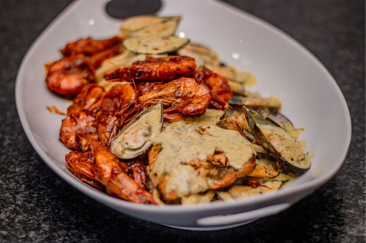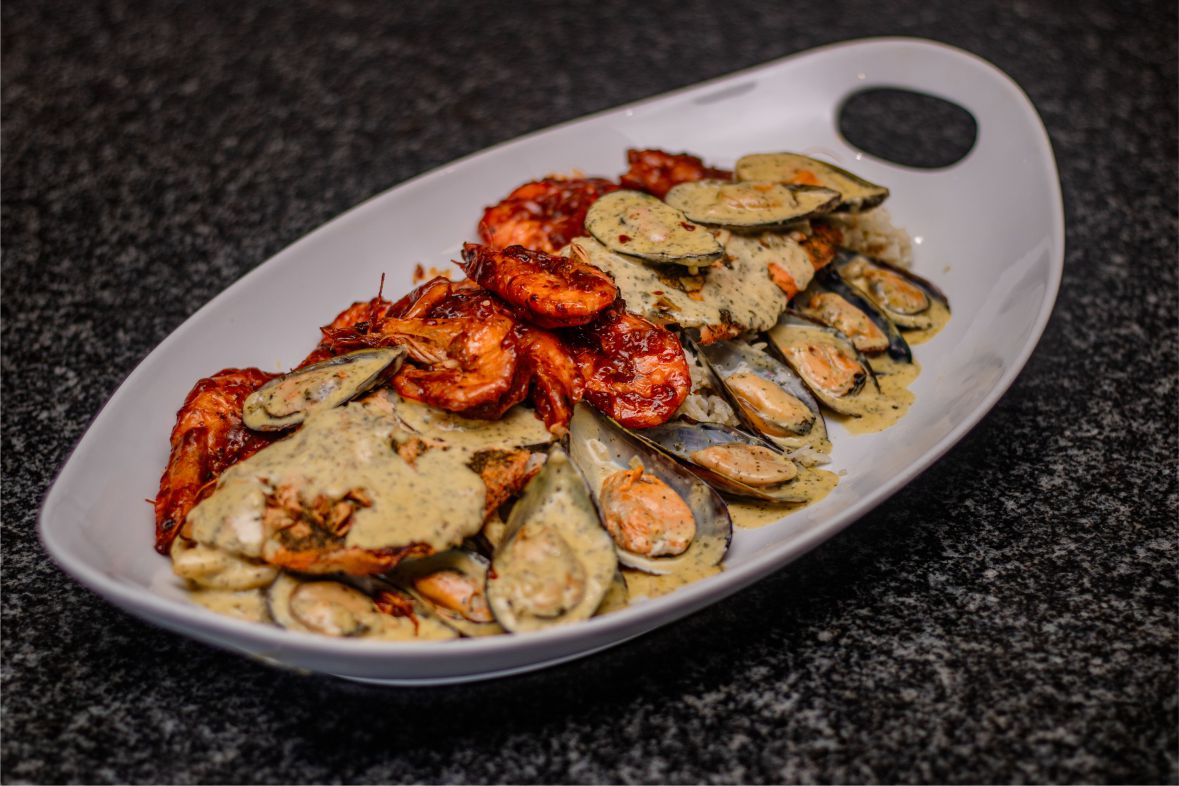 2 Maluti Trouts, 18 Prawns, 18 Calamaris, 18 Mussels, Served on a bed of Savoury rice and a side of creamy spinach