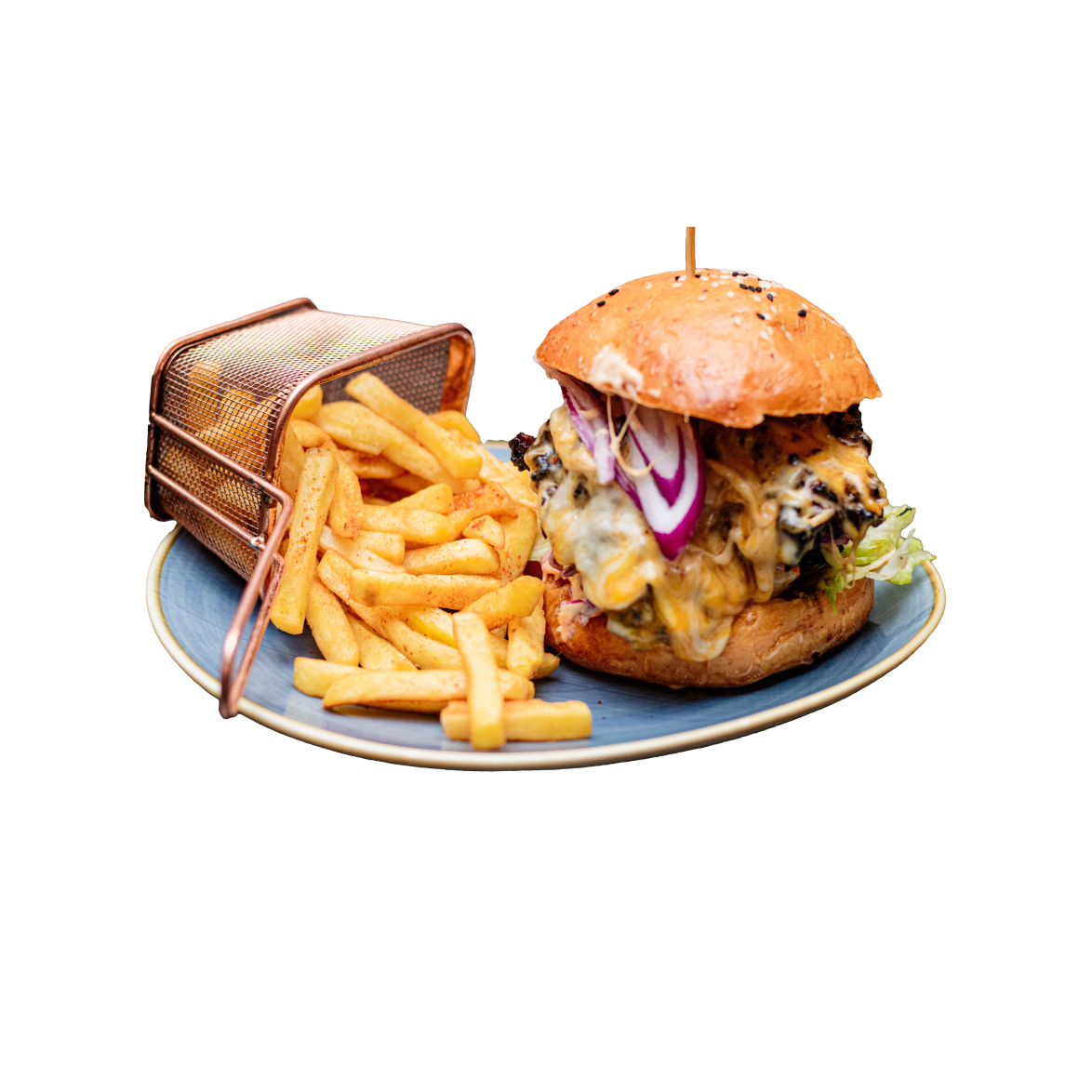 2 Beef Patties, Caramelized Onions, Coleslaw, Cucumber, Rocket, Tomato slices & cheese