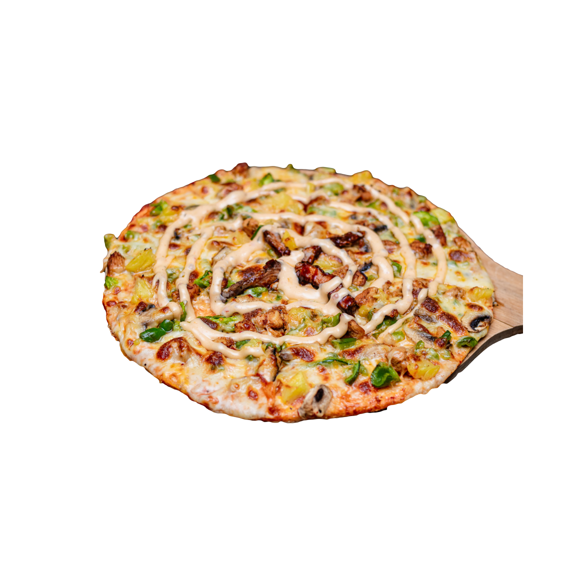 Onion, Peppers, Mushrooms, Olives, Fresh Chilli Pineapple, Chicken And Sriracha Mayo