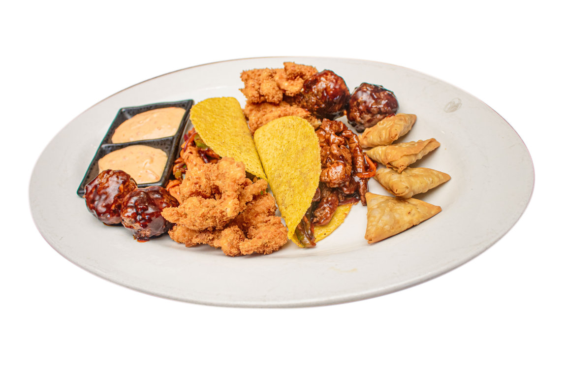 2 Beef Tacos, 4 Sweet Chilli Meatballs, 4 Samoosas, Crumbed Chicken Strips, siracha sauce and sweet chilli mayo.